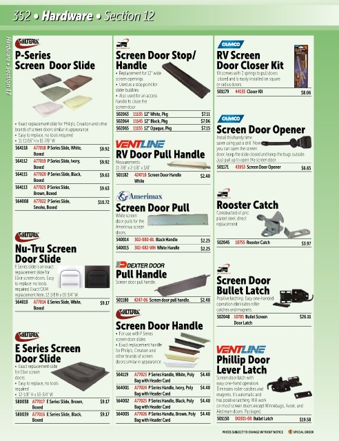 564010 A77014 E Series Slide, White, $9.17 501180 4247-06 Screen door pull handle. $2.40 Positive latching. Easy one-handed