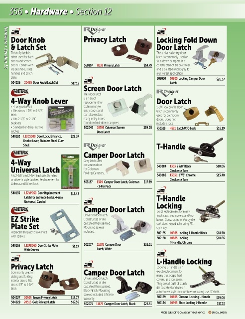 • Standard or drive-in style 502049 10795 Coleman Screen $19.05 730318 H521 Latch W/O Lock $16.19