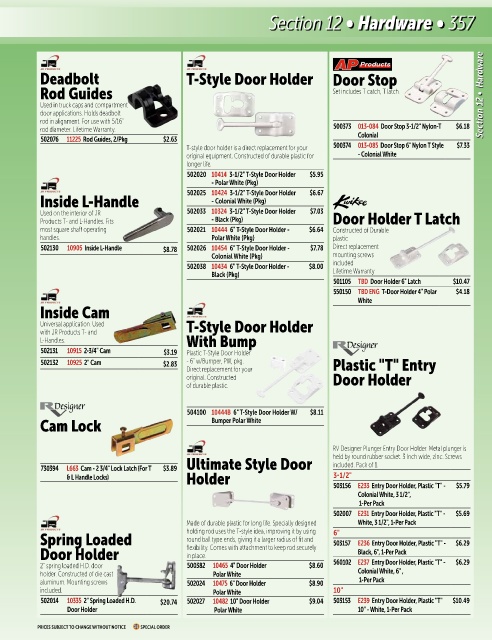 502014 10335 2" Spring Loaded H.D. $20.74 502027 10482 10" Door Holder $9.04 503153 E239 Entry Door Holder, Plastic "T" $10.49