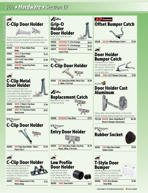 501082 E265 Entry Door Holder - Metal / $5.69 503255 E242 Entry Door Holder, Clip Only - $5.29 503162 E260 Entry Door Holder - $4.59
