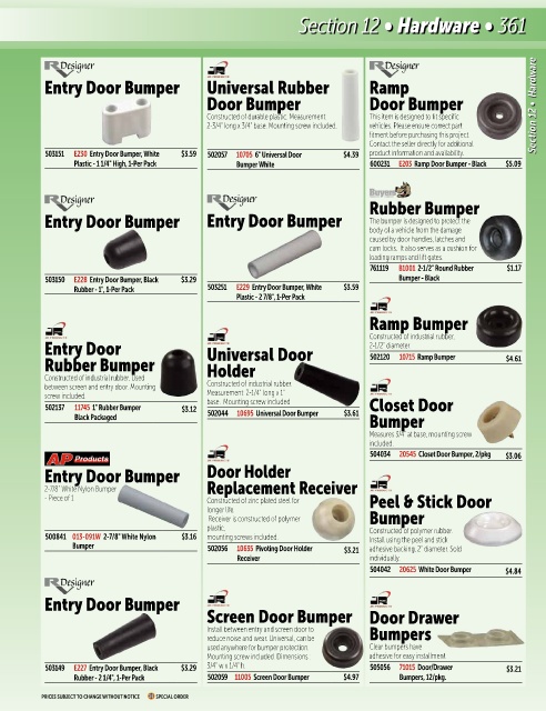 503151 E230 Entry Door Bumper, White $3.59 502057 10705 6" Universal Door $4.39 product information and availability.