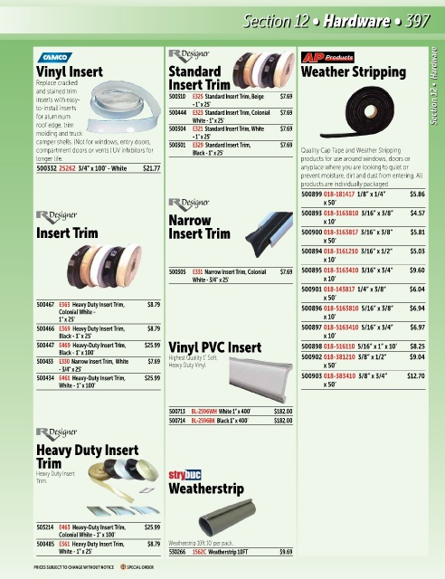 500447 E469 Heavy-Duty Insert Trim, $25.99 Vinyl PVC Insert 500898 018-516110 5/16” x 1” x 10’ $8.25