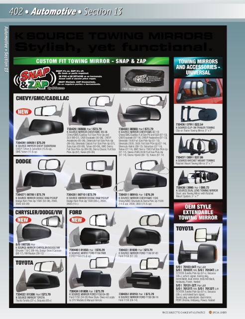 730432 | 81300: Pair | $73.79 K SOURCE MIRROR FORD F150 04-08 730435 | 81810: Pair | $73.79 (08+), w/smoked turn signal,
