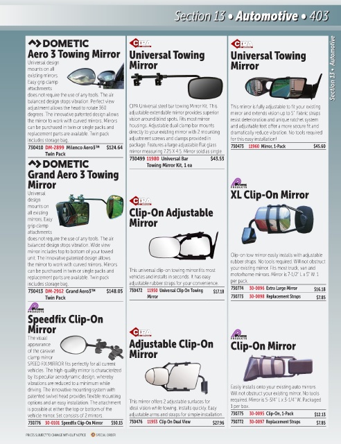 730413 DM-2912 Grand Aero3™ $148.05 730472 11950 Universal Clip On Towing $17.18 730774 30-0096 Extra Large Mirror $16.18