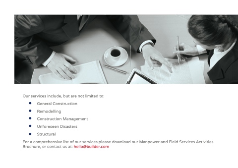 For a comprehensive list of our services please download our Manpower and Field Services Activities Brochure, or contact us at: hello@builder.com