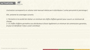 L’activation correspond à un volume total mensuel réalisé par le distributeur ( achat personnel et parrainage )