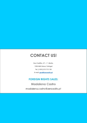 CONTACT US! Rua Castilho, 57 – 1.º direito, 1250-068 Lisboa, Portugal Tel.: (+351) 213 713 130 E-mail: geral@zeroaoito.pt FOREIGN RIGHTS SALES: Madalena Castro madalena.castro@zeroaoito.pt