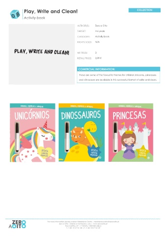 Play, Write and Clean! Activity book Zero a Oito 4-6 years Activity book N/A 3 3,99 € These are some of the favourite themes for children.Unicorns, princesses and dinossaurs are available in this successful format of write and clean.