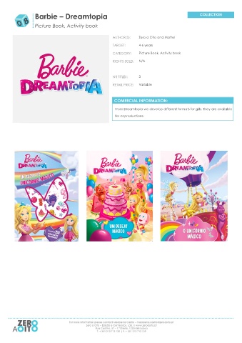 Barbie – Dreamtopia Picture Book, Activity book Zero a Oito and Mattel 4-6 years Picture Book, Activity book N/A 3 Variable From Dreamtopia we develop different formats for girls. They are available for coproductions.