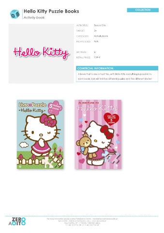 Hello Kitty Puzzle Books Activity book Zero a Oito 3+ Activity book N/A 2 7,99 € A book that is also a toy? Yes, with Hello Kitty everything is possible! In each book, kids will find five different puzzles and five different stories!