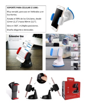 SOPORTE PARA CELULAR $ 3.000.- Muy versátil, para uso en Vehículos y en Escritorios. Acepta el 99% de los Celulares, desde 52mm (2,1”) hasta 90mm (3,5”). Gira en 360°, múltiples posiciones. Diseño elegante e innovador.