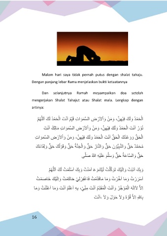 Malam hari saya tidak pernah putus dengan shalat tahaju. Dengan panjang lebar Rama menjelaskan bukti ketaatannya Dan selanjutnya Ramah meyampaikan doa setelah mengerjakan Shalat Tahajut atau Shalat mala. Lengkap dengan artinya: 16