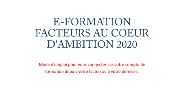 E-FORMATION FACTEURS AU COEUR D'AMBITION 2020 Mode d’emploi pour vous connecter sur votre compte de formation depuis votre facteo ou à votre domicile.
