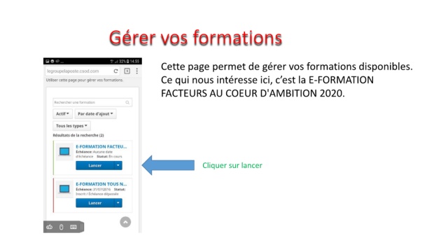 Gérer vos formations Cette page permet de gérer vos formations disponibles. Ce qui nous intéresse ici, c’est la E-FORMATION FACTEURS AU COEUR D'AMBITION 2020. Cliquer sur lancer