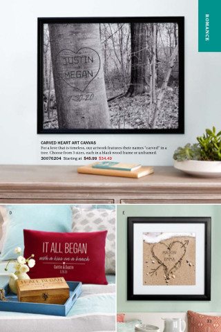 CARVED HEART ART CANVAS For a love that is timeless, our artwork features their names “carved” in a tree. Choose from 3 sizes, each in a black wood frame or unframed. 30076204 Starting at $45.99 $34.49 D E 33 ROMANCE