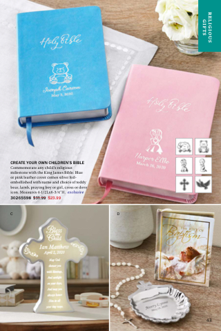 CREATE YOUR OWN CHILDREN’S BIBLE Commemorate any child’s religious milestone with the King James Bible. Blue or pink leather cover comes silver foil- embellished with name and choice of teddy bear, lamb, praying boy or girl, cross or dove icon.Measures4-1/2Lx6-3/4"H. exclusive