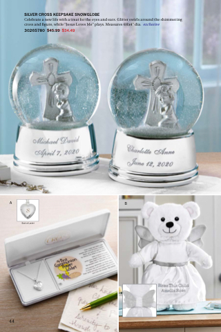 SILVER CROSS KEEPSAKE SNOWGLOBE Celebrate a new life with a treat for the eyes and ears. Glitter swirls around the shimmering cross and figure, while “Jesus Loves Me” plays. Measures 6Hx4" dia. exclusive 30265780 $45.99 $34.49 A 44 Back of Locket B