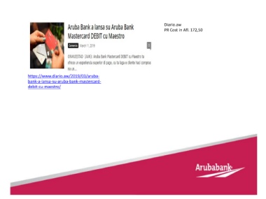 Diario.aw PR Cost in Afl. 172,50 https://www.diario.aw/2019/03/aruba- bank-a-lansa-su-aruba-bank-mastercard- debit-cu-maestro/