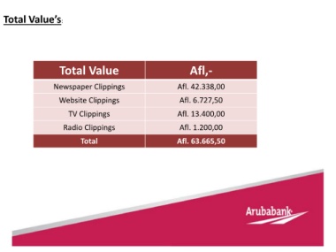 Total Value’s: Total Value Afl,- Newspaper Clippings Afl. 42.338,00 Website Clippings Afl. 6.727,50 TV Clippings Afl. 13.400,00 Radio Clippings Afl. 1.200,00 Total Afl. 63.665,50