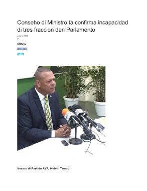 Conseho di Ministro ta confirma incapacidad di tres fraccion den Parlamento July 1, 2019 0 SHARE Facebook Twitter - Vocero di Partido AVP, Melvin Tromp