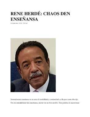 RENE HERDÉ: CHAOS DEN ENSEÑANSA 23 September, 2019, 10:00 am Normalmente enseñansa ta un area di trankilidad y continuidad cu Bo por conta riba dje. Ora tin intrankilidad den enseñansa, mester tin un bon motibo. Den palabra di maestronan