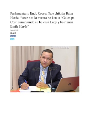 Parlamentario Endy Croes: Na e chikitin Baba Herde: “Awe nos lo mustra bo ken ta “Golos pa Cos” cuminsando cu bo casa Lucy y bo ruman Emile Herde” August 21, 2019 SHARE Facebook Twitter