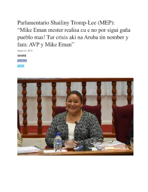 Parlamentario Shailiny Tromp-Lee (MEP): “Mike Eman mester realisa cu e no por sigui gaña pueblo mas! Tur crisis aki na Aruba tin nomber y fam: AVP y Mike Eman” August 21, 2019 SHARE Facebook Twitter