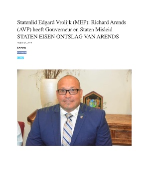 Statenlid Edgard Vrolijk (MEP): Richard Arends (AVP) heeft Gouverneur en Staten Misleid STATEN EISEN ONTSLAG VAN ARENDS August 21, 2019 SHARE Facebook Twitter