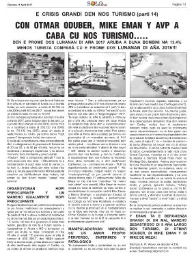 *E caida di 13.4 % den e cantidad di turistanan Otmar Oduber cu ta hunga e inocente santo Y ESAKI TA E BERGUENZA