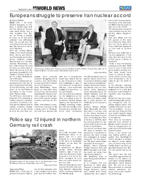 BERLIN (AP) — Police say 12 a train crashed into a trans- traffic between Hamburg Hunt called Iran's threat logue and avoid escalat-