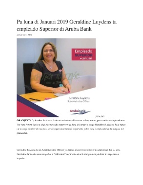 Tur luna Aruba Bank ta eligi su empleado superior y pa luna di Januari a scoge Geraldine Luydens. Pa e banco
