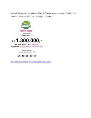 Na final, despues di e sorto di awe, Lotto di Aruba a opta pa aumenta e “jackpot” cu solamente 150 mil florin. Di 1.150.000 pa 1.300.000,=. https://24ora.com/premio-di-mini-mega-plus-ta-sigui-crece/