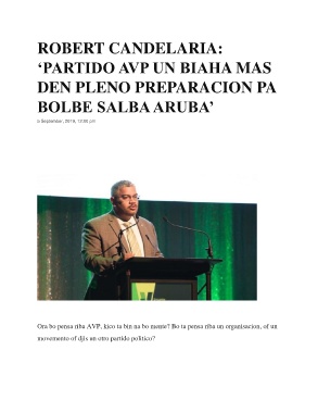 ROBERT CANDELARIA: ‘PARTIDO AVP UN BIAHA MAS DEN PLENO PREPARACION PA BOLBE SALBA ARUBA’ 5 September, 2019, 12:00 pm Ora bo pensa riba AVP, kico ta bin na bo mente? Bo ta pensa riba un organisacion, of un movemento of djis un otro partido politico?