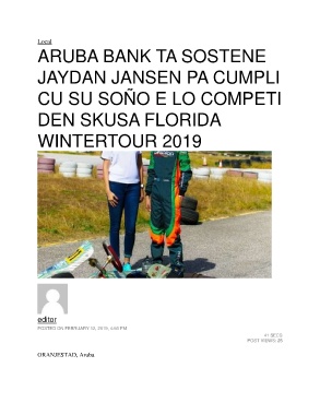 Local ARUBA BANK TA SOSTENE JAYDAN JANSEN PA CUMPLI CU SU SOÑO E LO COMPETI DEN SKUSA FLORIDA WINTERTOUR 2019 editor POSTED ON FEBRUARY 12, 2019, 4:56 PM 41 SECS POST VIEWS: 25 ORANJESTAD, Aruba