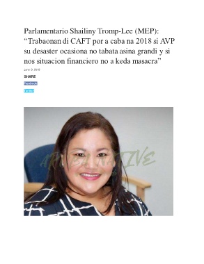 Parlamentario Shailiny Tromp-Lee (MEP): “Trabaonan di CAFT por a caba na 2018 si AVP su desaster ocasiona no tabata asina grandi y si nos situacion financiero no a keda masacra” June 9, 2019 SHARE Facebook Twitter