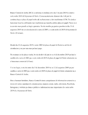 Banco Central di Aruba (BCA) a informa cu dialuna awo dia 3 di juni 2019 lo emiti e