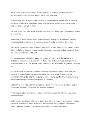 Autonomia di Aruba a base di realisacion di Status Aparte a bira realidad a base di