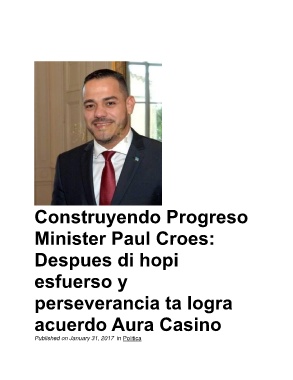 Construyendo Progreso Minister Paul Croes: Despues di hopi esfuerso y perseverancia ta logra acuerdo Aura Casino Published on January 31, 2017 in Politica
