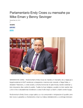 ORANJESTAD (AAN): Parlamentario Endy Croes ta manda un mensahe cla y raspa pa e