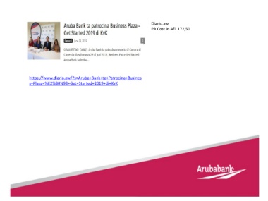 Diario.aw PR Cost in Afl. 172,50 https://www.diario.aw/?s=Aruba+Bank+ta+Patrocina+Busines s+Plaza+%E2%80%93+Get+Started+2019+di+KvK