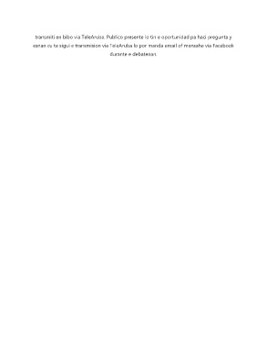 transmiti en bibo via TeleAruba. Publico presente lo tin e oportunidad pa haci pregunta y esnan cu ta sigui e transmision via TeleAruba lo por manda email of mensahe via Facebook durante e debatenan.