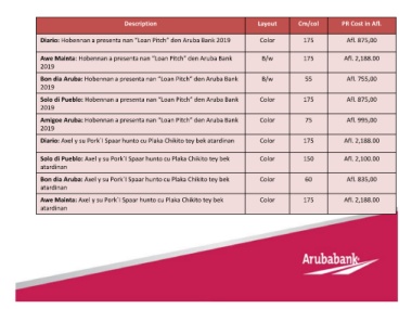 Description Layout Cm/col PR Cost in Afl.