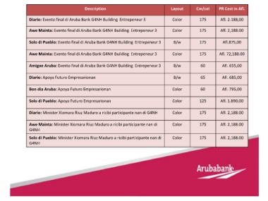 Description Layout Cm/col PR Cost in Afl.