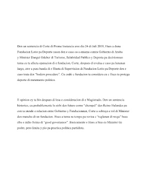 Den un sentencia di Corte di Prome Instancia awe dia 24 di Juli 2019, Hues a duna