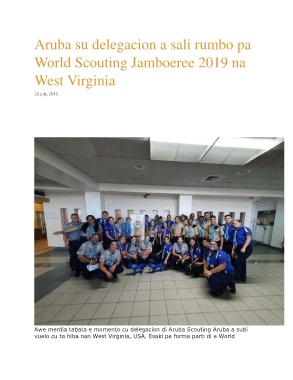 Aruba su delegacion a sali rumbo pa World Scouting Jamboeree 2019 na West Virginia 20 July, 2019 Awe merdia tabata e momento cu delegacion di Aruba Scouting Aruba a subi vuelo cu ta hiba nan West Virginia, USA. Esaki pa forma parti di e World