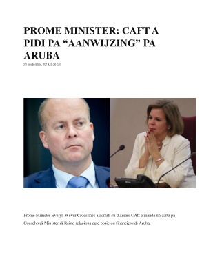 PROME MINISTER: CAFT A PIDI PA “AANWIJZING” PA ARUBA 24 September, 2019, 6:30 pm Prome Minister Evelyn Wever Croes mes a admiti cu diamars CAft a manda un carta pa Conseho di Minister di Reino relaciona cu e posicion financiero di Aruba.