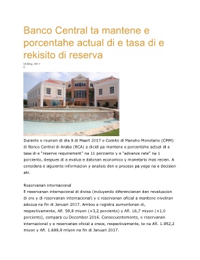 di Banco Central di Aruba (BCA) a dicidi pa mantene e porcentahe actual di e