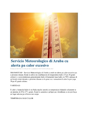 ORANJESTAD - Servicio Meteorologico di Aruba a emiti un alerta pa calor excesivo pa
