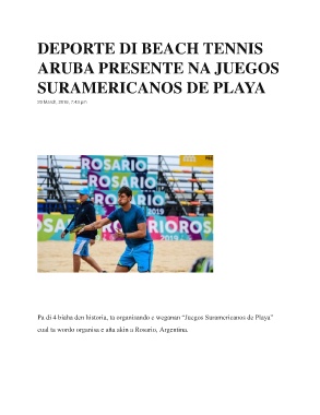 DEPORTE DI BEACH TENNIS ARUBA PRESENTE NA JUEGOS SURAMERICANOS DE PLAYA 20 March, 2019, 7:43 pm Pa di 4 biaha den historia, ta organisando e weganan “Juegos Suramericanos de Playa” cual ta wordo organisa e aña akin a Rosario, Argentina.