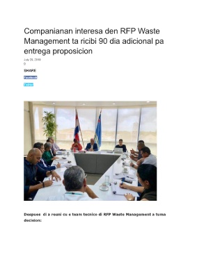 Companianan interesa den RFP Waste Management ta ricibi 90 dia adicional pa entrega proposicion July 20, 2019 0 SHARE Facebook Twitter Despues di a reuni cu e team tecnico di RFP Waste Management a tuma decision: